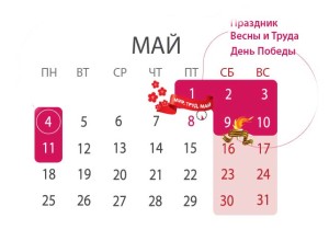 - 1,2,3,4 мая – официальные выходные дни;